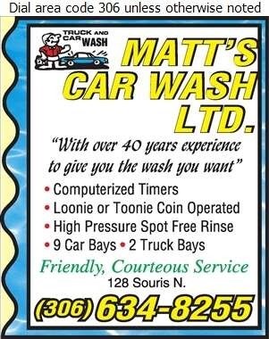 Punch card for Carwashes, valued at $50. Cannot be redeemed for Cash! Matt's Carwash is located at 28 Souris Ave, North, Estevan, SK S4A 1J6. Offers a great fresh wash for your truck or car with Computerized Timers, High Pressure Wash Bays, Spot Free Rinse and more. Phone: (306) 634-8255