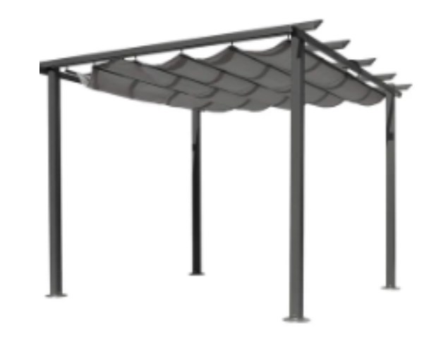 The My Patio 10’ x 10’ Aluminum Pergola features a durable, rust‑resistant frame and a retractable fabric canopy for adjustable shade. Perfect for patios or backyard seating areas, it provides a stylish, low‑maintenance outdoor space that can be customized from full sun to full shade.