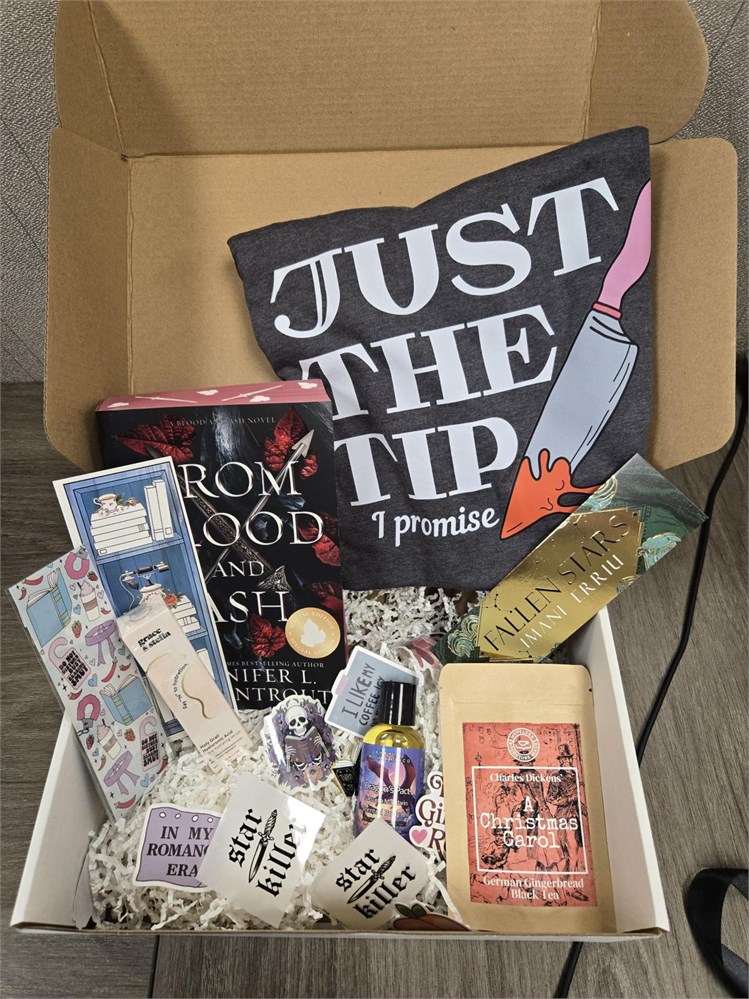 Selfcare Book Box - T-shirt (medium), tea, Dragon's Pack body oil, hydrating serum, bookmarks, Special Edition "From Blood and Ash" novel by Jennifer L. Armentrout