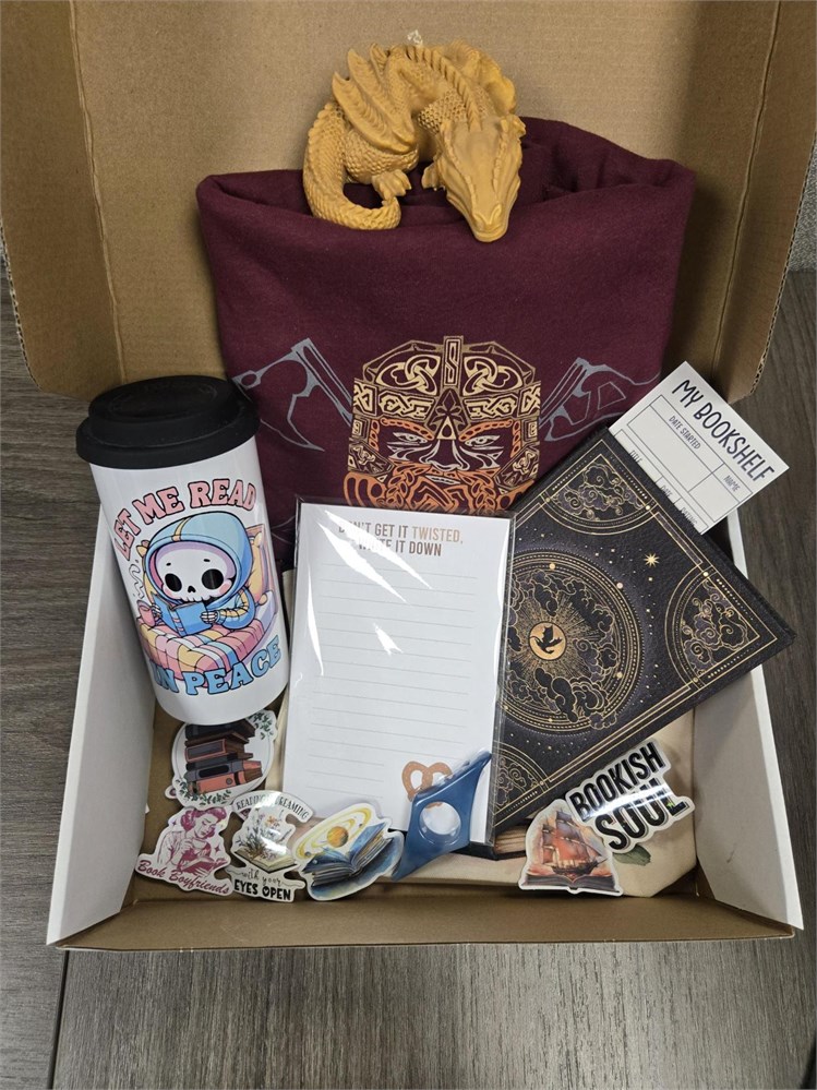 Book Merch Gift Box - T-shirt (medium), travel mug, notebook, my bookshelf bookmark, notepad, page holder, makeup bag, scented dragon candle