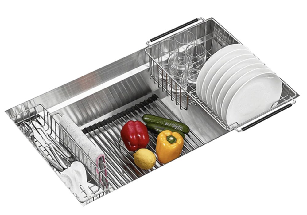 It comes with a variety of kitchen essential accessories that can be attached to the sink delivering functionality, more space, and style to your kitchen. Including a flat basket strainer, cutting board, colander plate, dish rack, cutlery rack, and two roll mats. Designed with straight corners maximizing your freedom of movement, it is hand-crafted to perfection.