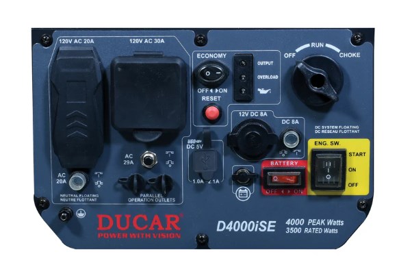 The DUED4000I inverter generator, equipped with a 7.5 HP (224 cc) Ducar engine, delivers a maximum power of 4,000 W and a rated power of 3,500 W at 120 V and 60 Hz, capable of powering multiple devices, including electronic equipment.