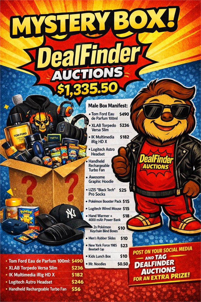 Mens value gift box rom DealFinders Auction! Includes Men's Tom Ford Eau De Parfum Logitech Astro Headset Pokemon Booster Pack and much more!!