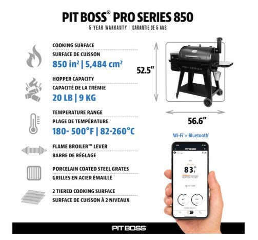 This Grill is a great way to help you achieve professional-grade results. This pellet grill features a digital PID control board and advanced technology for even temperatures and convenient Wi-Fi and Bluetooth compatibility. Download the Pit Boss Smoke IT application to maximize your grilling experience by controlling temperature settings, monitoring your grill's meat probes, and getting notifications about cooking conditions. The PB850PS2 is highly versatile, as it lets you sear, smoke, roast, chargrill, braise, bake, and grill all your meats to perfection. The temperature ranges between 180 and 500°F, but can reach 1000 °F with a direct-flame broiler, perfect for searing! It also comes with an 850 in² cooking area with two tiers of removable cooking grids. This powerful machine delivers unbeatable results using 100% all-natural hardwood fuel.