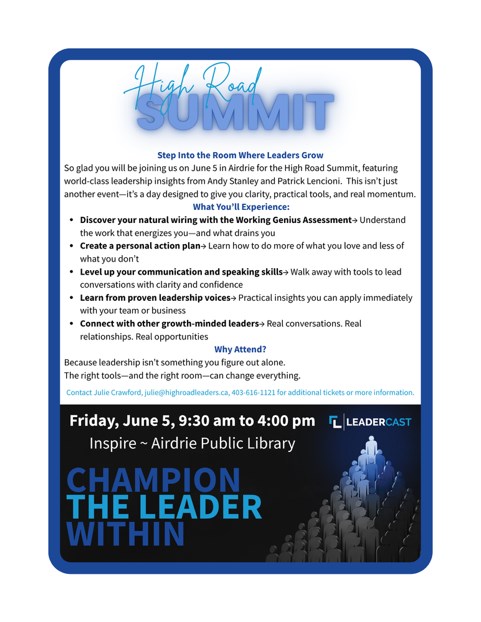 Join us on June 5 in Airdrie for the High Road Summit, featuring world-class leadership insights from Andy Stanley and Patrick Lencioni.