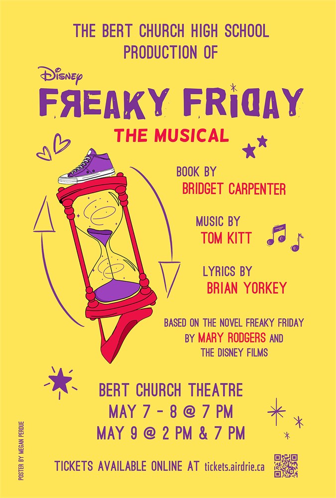 Disney's Freaky Friday - Saturday, May 9 @ 2pm: 4 tickets Bert Church High School presents a musical theatre production of Disney's Freaky Friday. Experience the story of a mother and daughter who magically swap bodies and must navigate each other's worlds for one unforgettable day. Through humour, music, and heart, they discover empathy, acceptance, and what it truly means to support one another. Featuring live music from Bert Church High School's band students!