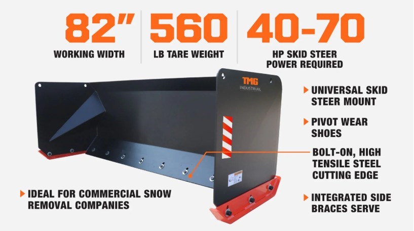 Elite Ag in Ogema is your trusted TMG Industrial Dealer. 7' Skid Steer universal mount snow pusher w/Steet Cutting Edge, Pivoting Wear Soes, Side Braces. Requires 40-70 HP. A bolt-on, high tensile steel cutting edge is resistant to wear and will make sure you scrape snow right down to the pavement for a clean, professional finish. Integrated side braces serve to increase the strength and stability of the already heavy-duty 560 lb construction of this snow pusher.