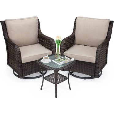 The Melbourne bistro set includes two high back armchairs that swivel and a coffee table. Synthetic wicker over a powder coated frame made from a high-quality carbon steel alloy for great strength and durability. Tempered glass tabletop. Comfortable, water repellant, weather resistant, and easy to clean Olefin cushions. Capacity 152kg/335lbs.