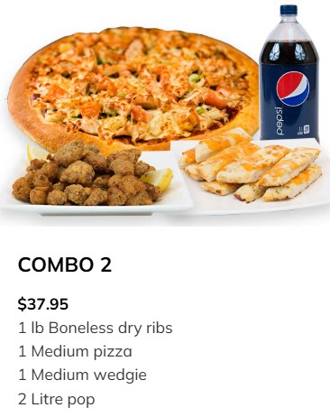 TJ’s Pizza – Proudly serving Moose Jaw since 2004! Famous for fresh daily dough, hand-crafted signature sauce, and a secret pizza spice blend, TJ’s delivers flavor in every bite. 2 - Combo #2 Includes: 1 Medium Pizza, 1LB Dry Ribs, 1 Medium Wedgie and 2 Litre Pop – Value ($84.24)