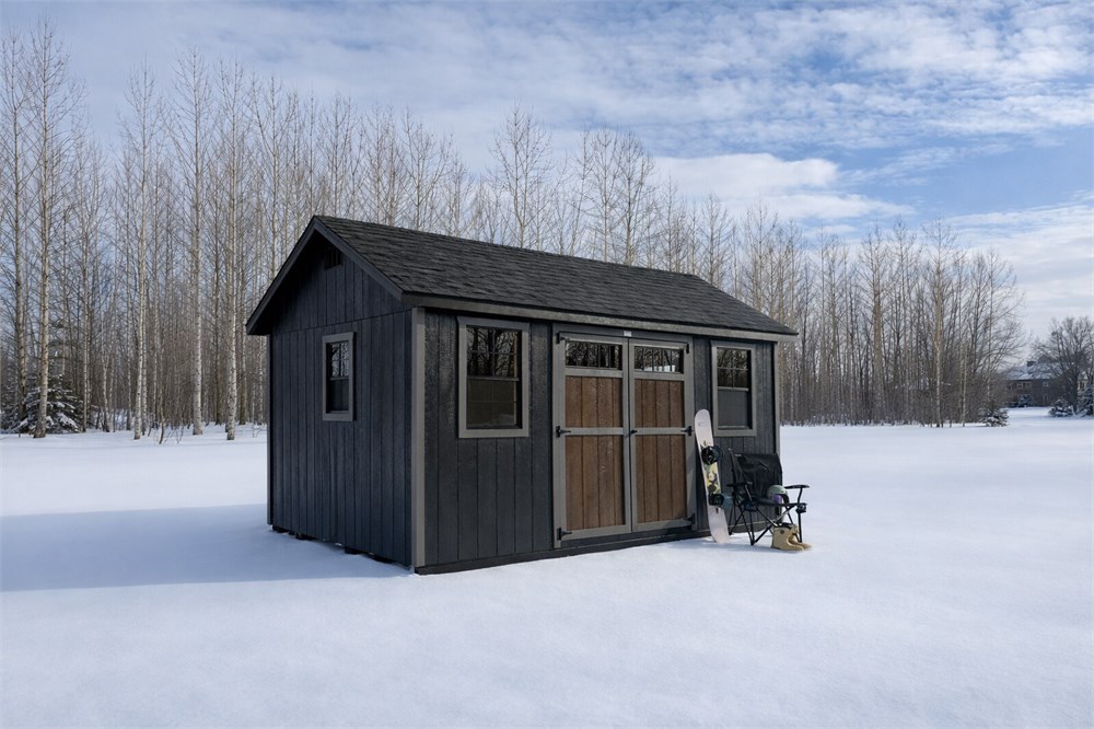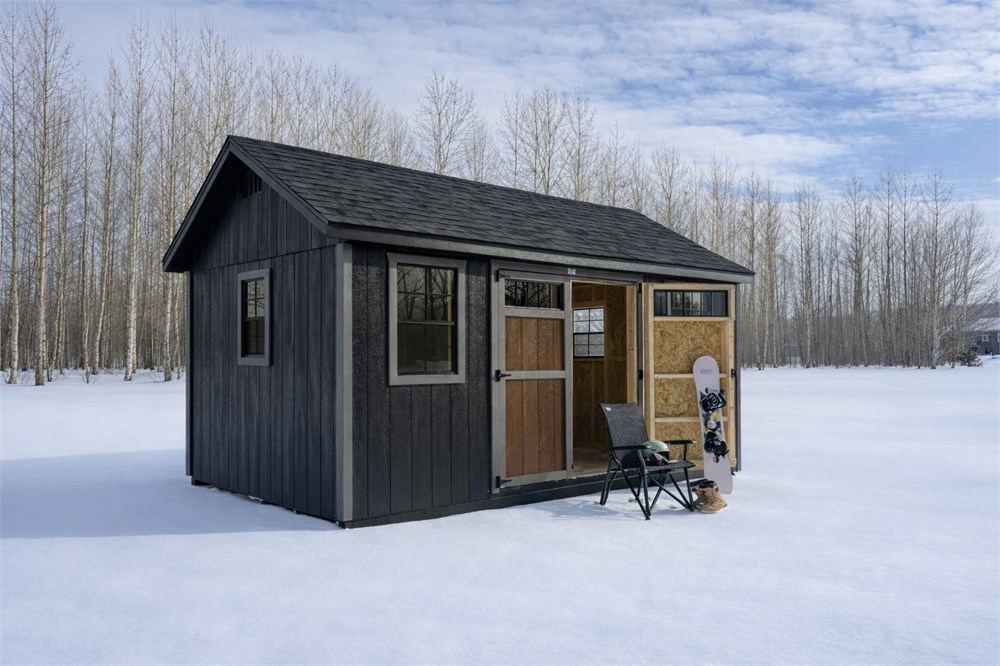 Built by Horizon Storage Shed this is a 160 square foot Cottage Style shed. Size is 10 x 16 feet, and the siding colour is Smokehouse, with onyx black shingles on the roof. On the front of the shed are two 24" x 36" windows as well as two 24" transom windows. Window trim is in the colour, horizon cedar. There is also a double door on the front for convenience. Shed includes a 10' x 24" workbench. *Delivery is included, if rural delivery is required, there may be a fee for mileage.