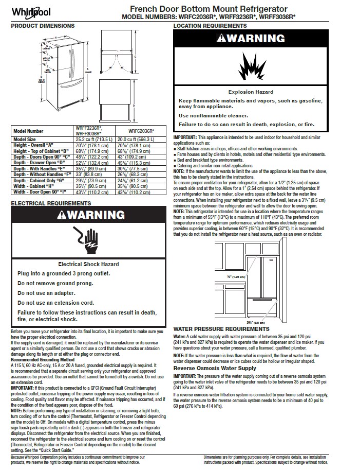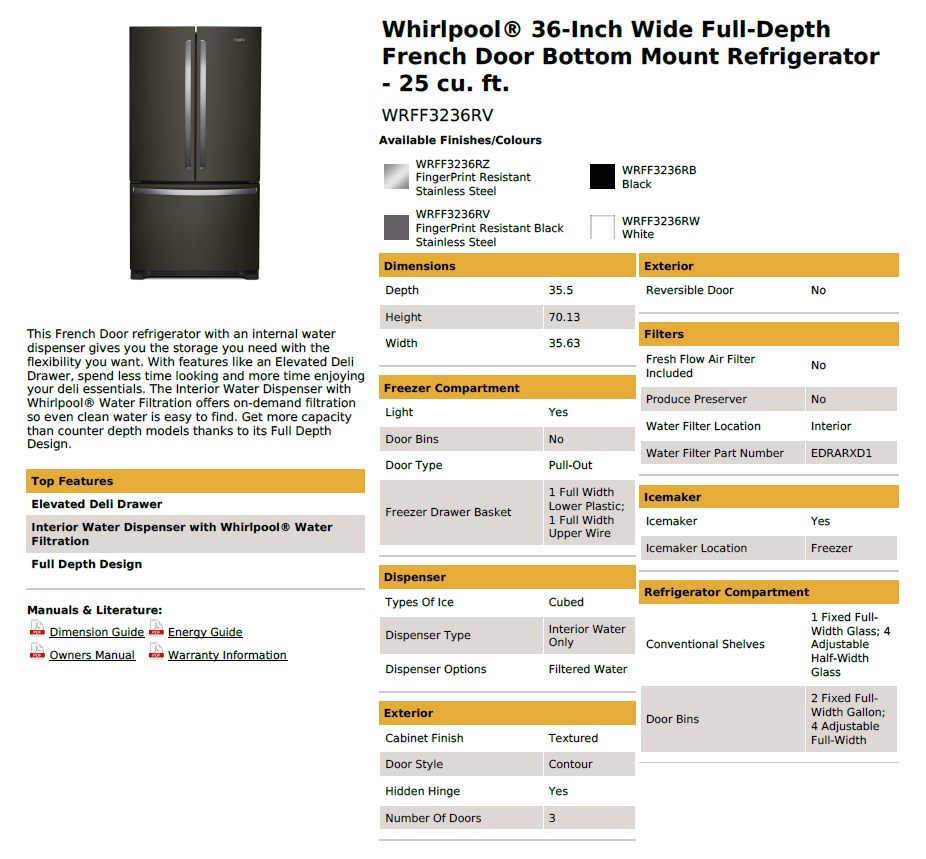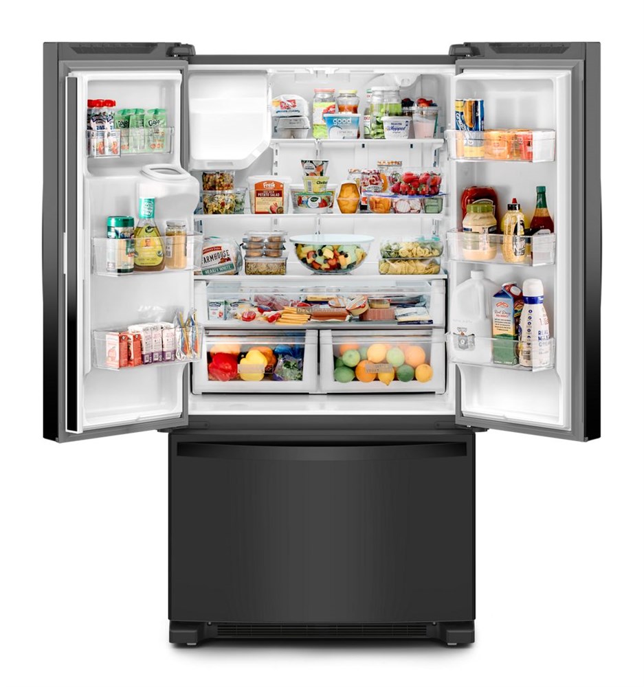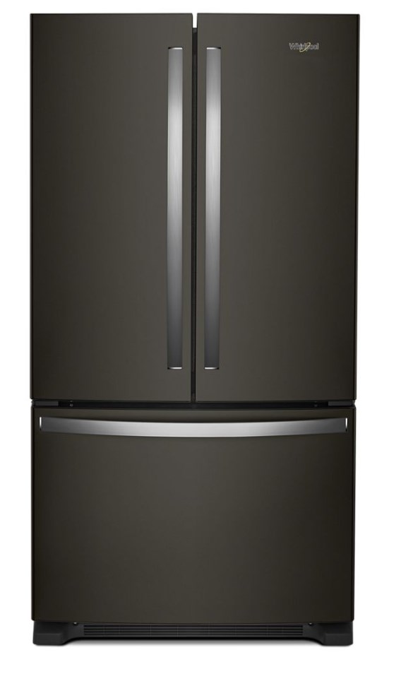 Whirlpool Black Stainless Steel French Door Fridge. This French Door refrigerator with internal water dispenser gives you the storage you need with the flexibility you want. With features like an Elevated Deli Drawer, spend less time looking and more time enjoying your deli essentials. The Interior Water Dispenser with Whirlpool® Water Filtration offers on-demand filtration so even clean water is easy to find. Get more capacity than counter depth models thanks to its Full Depth Design.