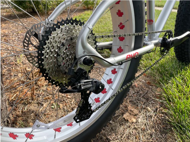 This beauty clocks in at 36.7 pounds of pure Love & Thunder! With the matte silver paint you can REALLY get lost in the snow and those wheel reflectors look like swirling icicles.! The Maple Leaf cut-outs in the rims really take you to the Great White North! Crush the tundra with the huge 4.9” wide tires! Aggressive front rake lets this baby descend faster than an elevator with a broken cable!