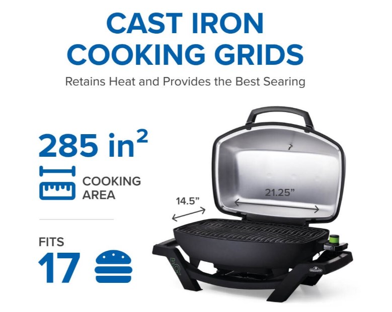 285 in² / 1839 cm² total cooking area provides enough space for up to 17 burgers at once.